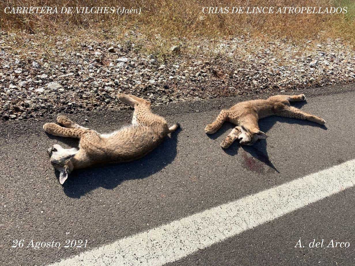 La imagen la ha hecho pública el linarense Antonio del Arco en sus redes sociales, quien ha explicado que en la mañana de este jueves han aparecido los cadáveres de estas dos crías de linces ibéricos. Del Arco ubica el suceso en el arcén de la carretera entre Linares y Vilches «muy cerca de la finca La Marquesa.