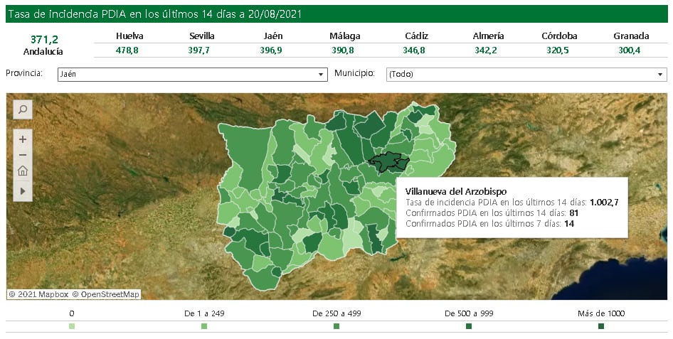 La incidencia sigue alta, por encima de 1.000, en municipios como Mengíbar o Villanueva del Arzobispo, aunque Bailén ha reducido ya este indicador hasta 889.