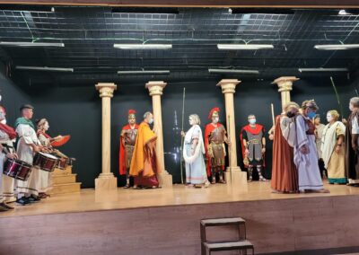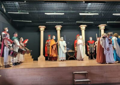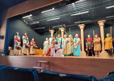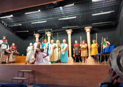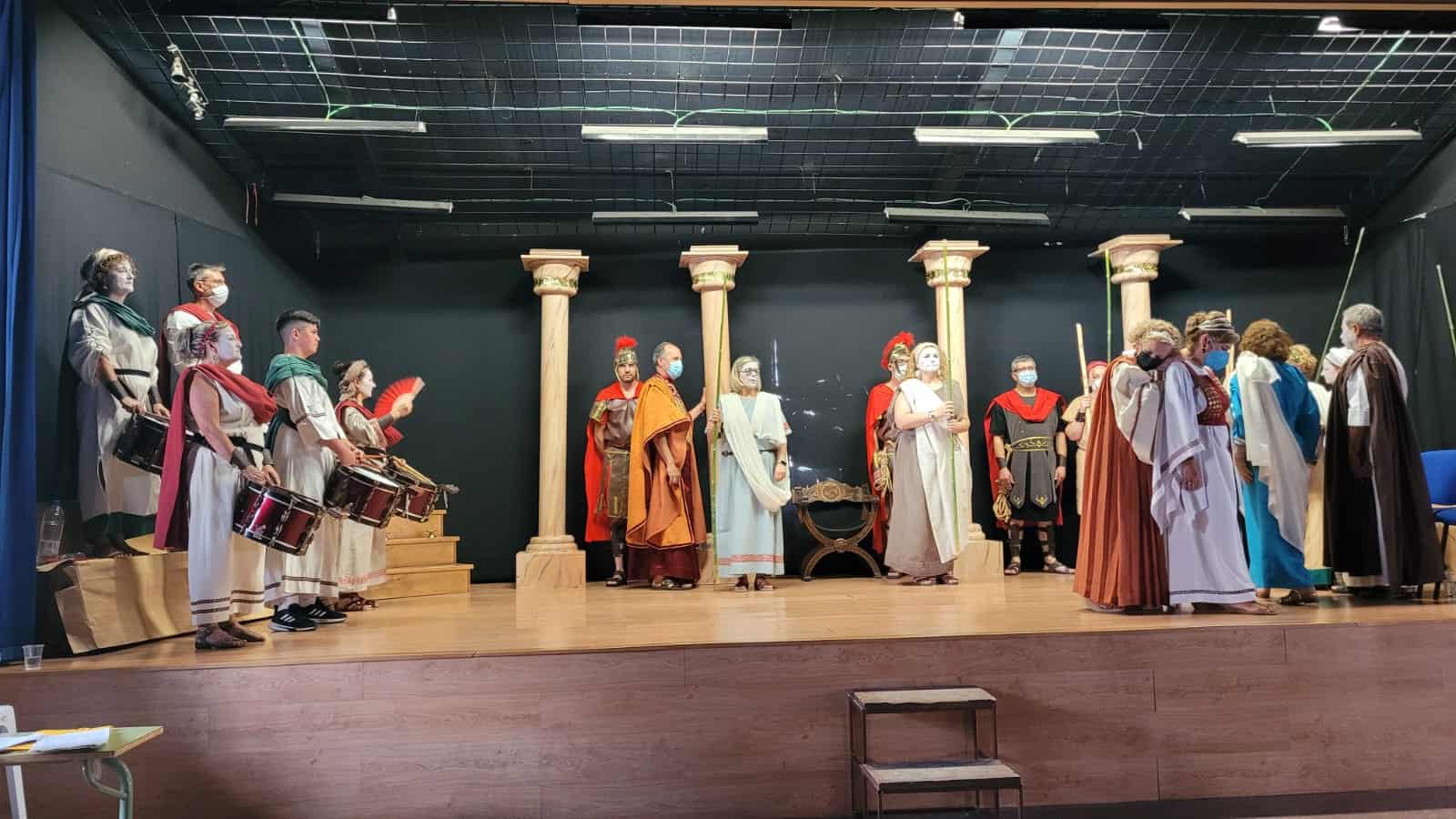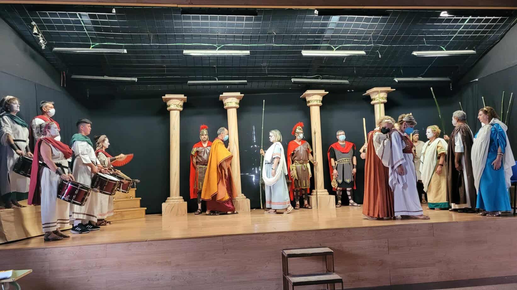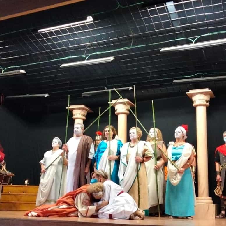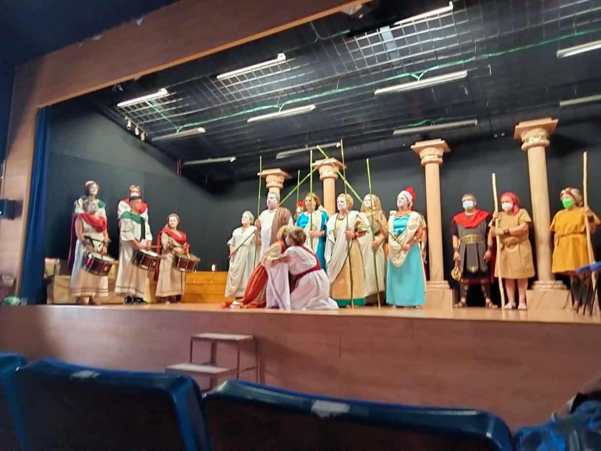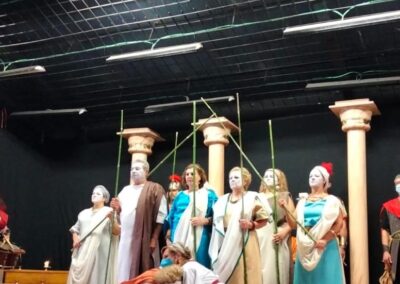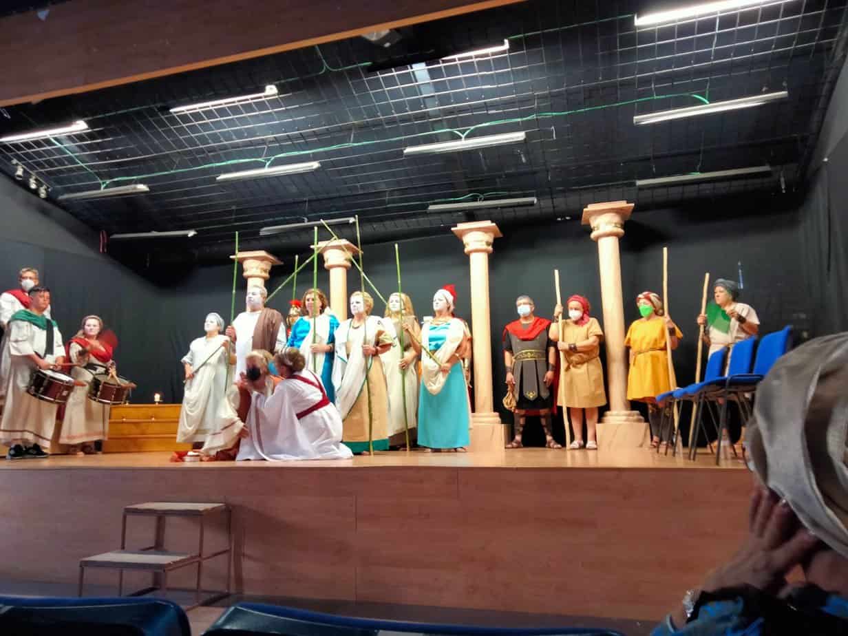 Se trata de una gran superproducción, con un elenco de más de treinta actores y actrices, que el grupo de teatro estable de la asociación comenzó a trabajar en 2018 con la idea de estrenarla en abril del año siguiente… pero cuatro días antes del estreno se declaró el estado de emergencia sanitaria. Sin duda es el proyecto teatral más ambicioso que han emprendido desde la asociación de mujeres y la primera vez que acometen el reto de representar una tragedia griega. En esta gran producción también han participado los cónyuges de algunas de las asociadas para interpretar los papeles masculinos.