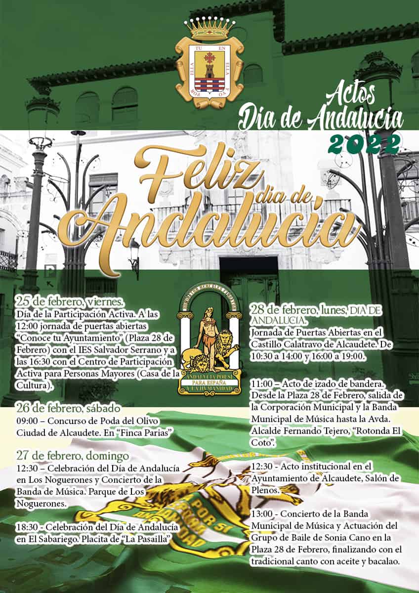 El acto principal tendrá lugar el sábado 28 de febrero, dando comienzo a las 11:00 de la mañana, partiendo desde la Plaza 28 de Febrero la comitiva acompañada por la Banda Municipal de Música de Alcaudete, recorriendo Calle Carnicería, Calle Fuente Zaide, Calle Lozanos, Haza del Conde hasta llegar a la isleta Calle Alcalde Fernando Tejero donde será izada la nueva bandera de Andalucía en este lugar. Al finalizar, tendrá lugar el Acto Institucional en el Salón de Plenos del Excmo. Ayuntamiento de Alcaudete donde hay convocado un Pleno Extraordinario a las 12:30 en el que se hará lectura de la Declaración Institucional por el Día de Andalucía. Al finalizar, en la Plaza 28 de Febrero, Concierto de la Banda Municipal de Música y actuación de la Escuela de Baile Sonia Cano, finalizando con el reparto del tradicional canto con aceite y bacalao.