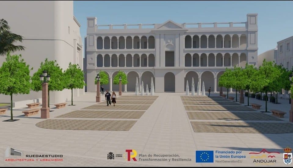 El Ayuntamiento de Andújar ha dado comienzo a las obras de humanización y peatonalización de la Plaza de España y de la Plaza de la Constitución, cofinanciado con Fondos Europeos Next Generation, a través de la subvención otorgada en el marco del plan de Recuperación, Transformación y Resiliencia del Gobierno de España.
