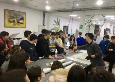 La actividad educativa permitió a los estudiantes el diseño de diferentes logotipos, manejando software de dibujo vectorial y que posteriormente pudieron trasladar a algunos objetos, como zapatillas deportivas o la letra griega «tau» símbolo de la comunidad franciscana en plegado de aluminio.