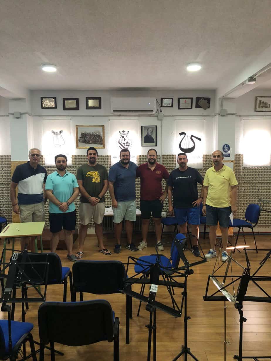 Reunión entre la Junta de Gobierno de la Hermandad de los Santos de Arjona y la Asociación Musical Lira Urgavonense para extender el convenio que une a las dos entidades en la celebración de Fiestasantos para el acompañamiento musical de los actos que la Hermandad organiza cada mes de agosto celebrar las fiestas en honor a los Santos Patronos de la ciudad, San Bonoso y San Maximiano.
