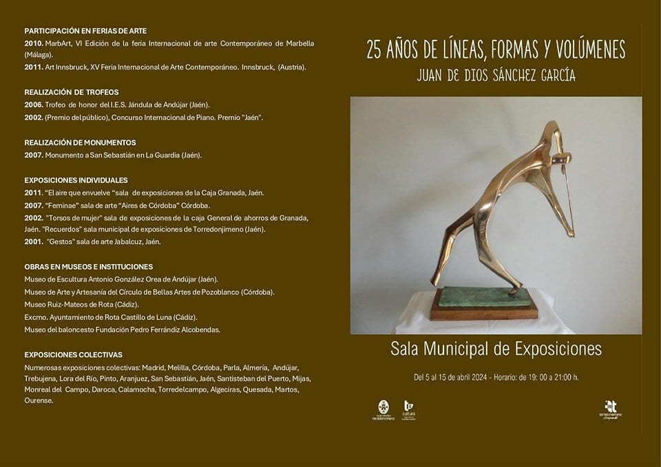 El último trabajo de Juan de Dios Sánchez García, 25 años de Líneas, Formas y Volúmenes, aterriza en Torredonjimeno del 5 al 15 de abril en la Sala Municipal de Exposiciones. La muestra se podrá visitar de 19:00 a 21:00 horas.