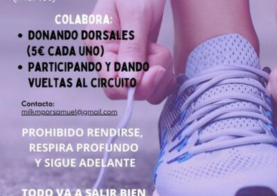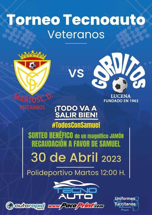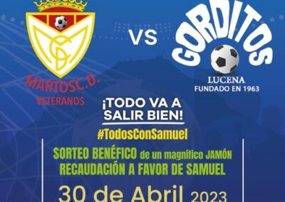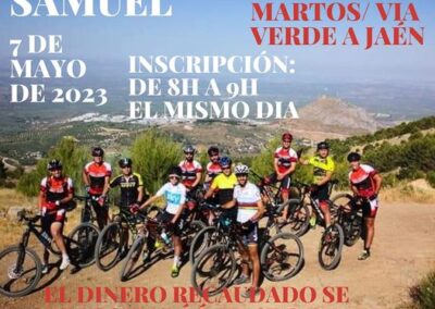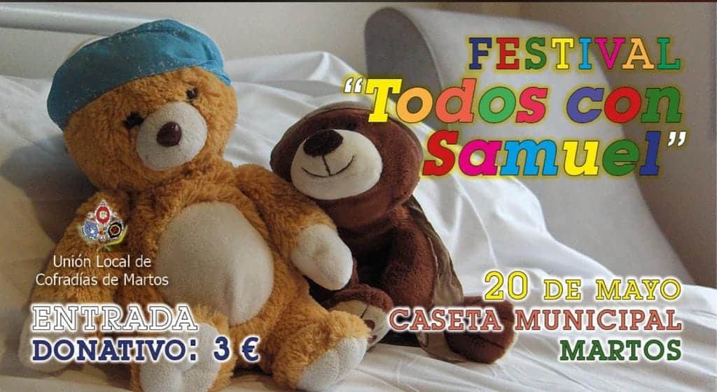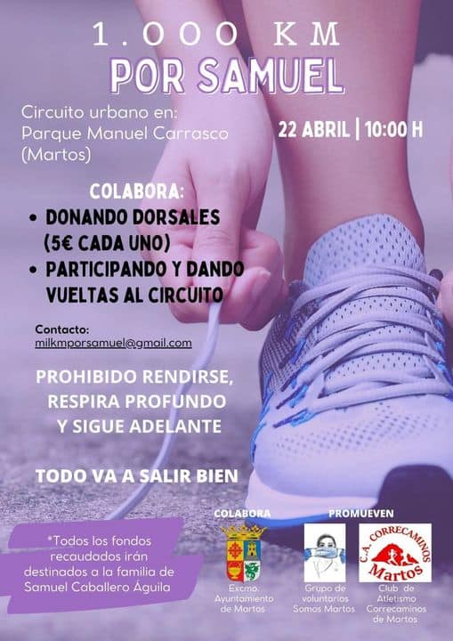 Así, el club de atletismo Correcaminos de Martos organiza «1.000 kilómetros por Samuel», una carrera benéfica que se celebrará el próximo sábado 22 de abril en un circuito urbano establecido en el Parque Manuel Carrasco. La Unión Local de Cofradías de Martos ha organizado para el próximo 20 de mayo un festival que bajo el lema «Todos con Samuel» se celebrará en la Caseta Municipal. También los veteranos del Martos CD quieren aportar su granito de arena y el próximo 30 de abril celebrarán un encuentro solidario en el polideportivo con el equipo de «Los gorditos» de la localidad cordobesa de Lucena. Del mismo modo se ha organizado una ruta en bicicleta de montaña desde Martos a Jaén por la Vía Verde del Aceite. Todos estos eventos, y más que surgirán en los próximos días, tendrán como único objetivo el donar el dinero de las entradas y de las inscripciones a las huchas para ayudar a Samuel.
