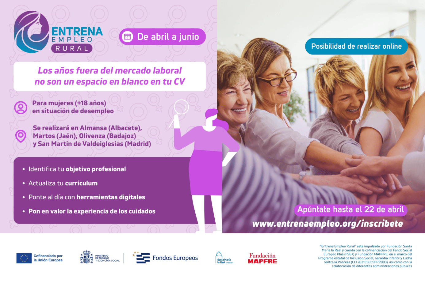 Las mujeres marteñas interesadas en participar en este programa, totalmente gratuito y con plazas limitadas, disponen hasta el 22 de abril para realizar su inscripción. Pueden hacerlo online en este enlace www.entrenaempleo.org/es/inscribete o ponerse en contacto con la técnica de empleo que los acompañará en su itinerario con el fin de conocer más detalles sobre el programa o consultar dudas sobre su inscripción: Paula Mariño, 621 157 463 o en pmarino@santamarialareal.org
