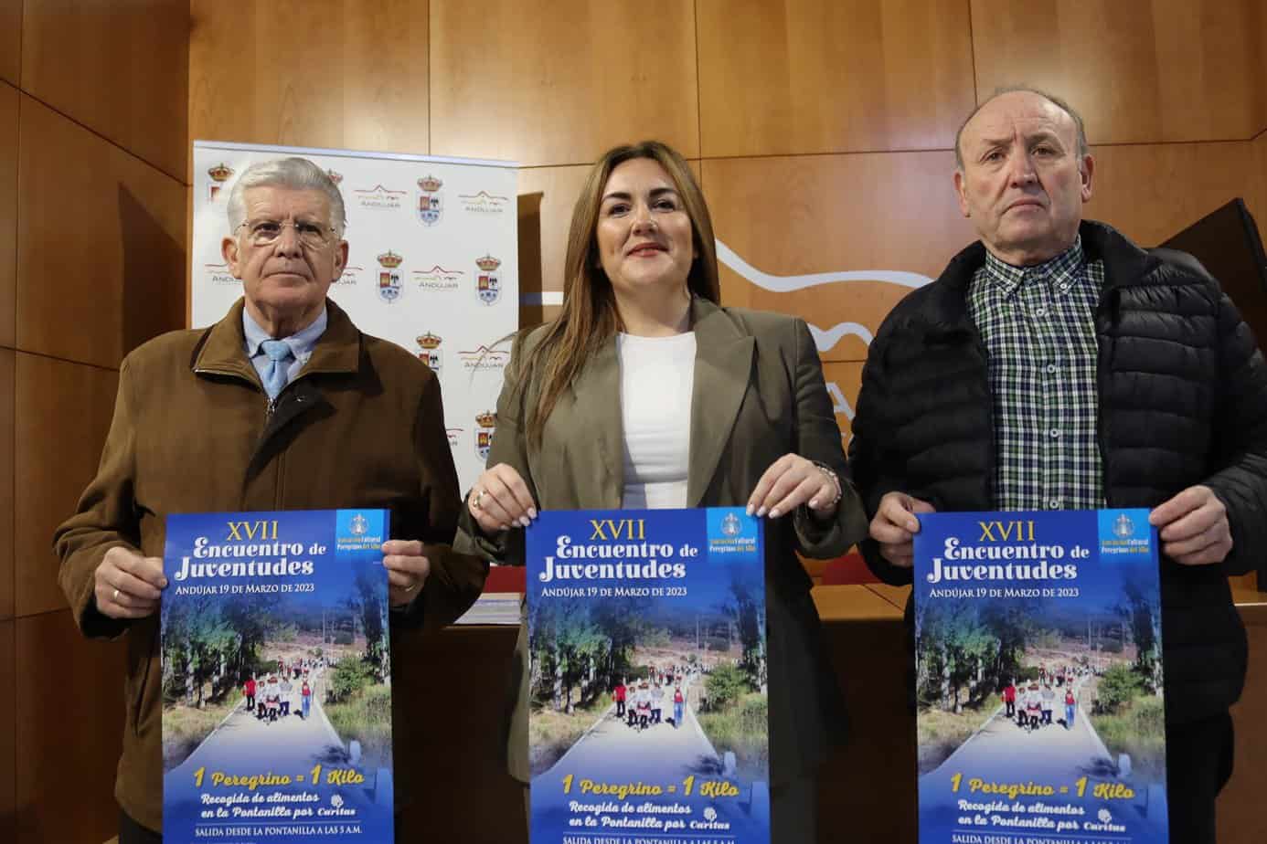 Teresa Fernández-Pacheco, concejala de Juventud del Ayuntamiento de Andújar, y el presidente de la Asociación Cultural Peregrinos del Alba, Manolo Luna y su vicepresidente, Julián Pérez, han presentado el cartel y la programación preparada para la XVII Edición del Encuentro de Juventudes “1 Peregrino = 1 kilo”.