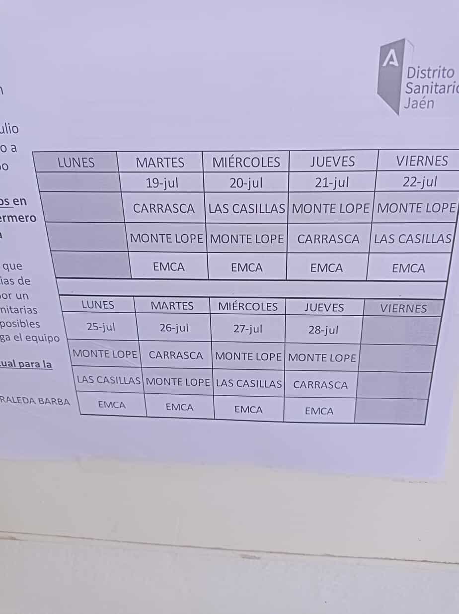 Según informa el Distrito Sanitario Jaén Sur, «debido a causas sobrevenidas» la atención médica primaria que se presta en los consultorios de Las Casillas, La Carrasca y Monte Lope Álvarez ha visto reducidos sus horarios de prestación en Medicina de Familia y confirman que la situación se restablezca a la normalidad el próximo 1 de agosto. No obstante, los consultorios permanecerán abiertos en su horario habitual atendidos por un enfermero y se ha reforzado el Equipo de Urgencias de Martos con un dispositivo EMCA formado por un enfermero y un técnico en emergencias sanitarias «para evitar la demora en la atención a las posibles urgencias que puedan surgir».