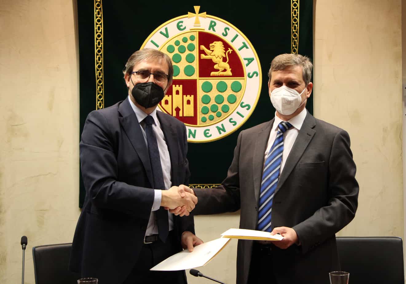 El Rector de la Universidad de Jaén (UJA), Juan Gómez Ortega, y el Director General de la Planta de Martos de Valeo Iluminación S.A.U., Manuel Sánchez Gijón, presentaron hoy el programa ‘Valeo UJA Academy’, un itinerario formativo dual internacional, que pretende la excelencia de su alumnado en el sector de la automoción.